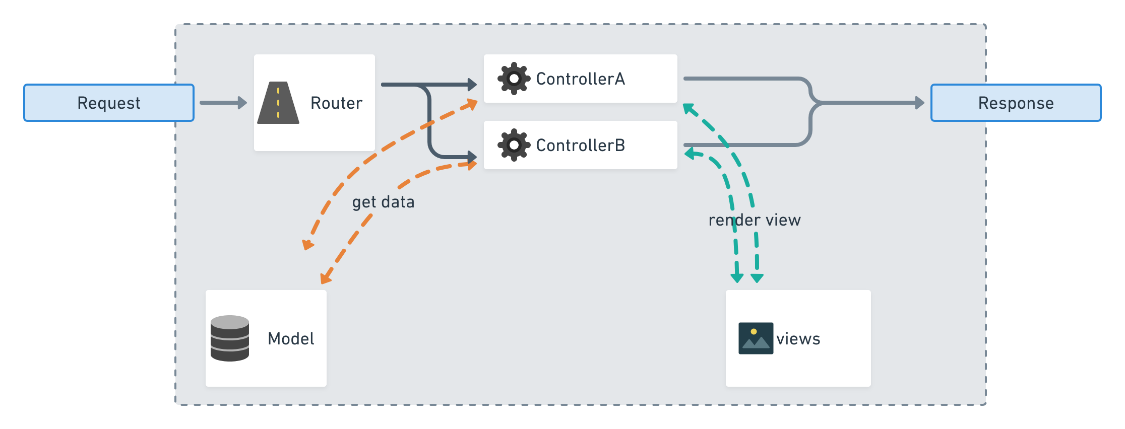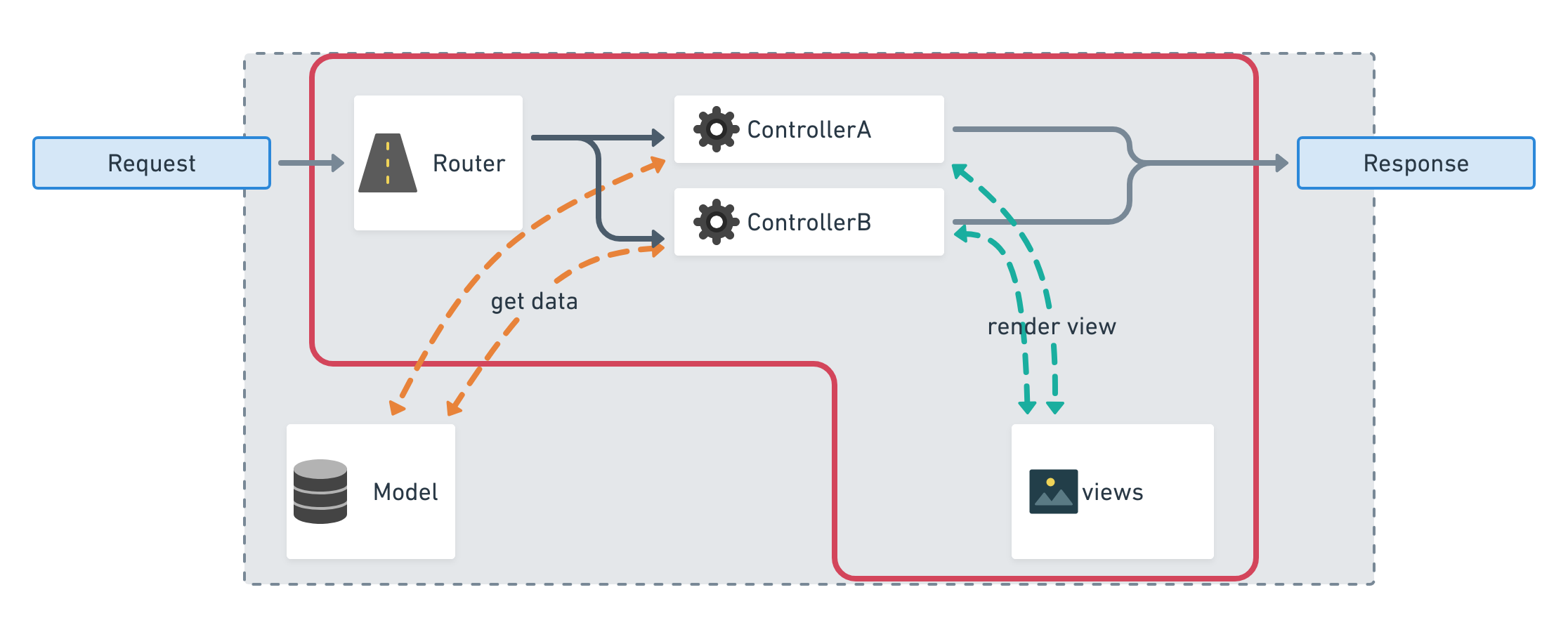 Un Routeur intercepte la Requête HTTP, l’envoie vers le Controller qui correspond. Celui-ci ira communiquer avec le Modèle de données et génèrera la Vue qu’il renverra en Réponse HTTP.